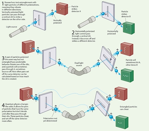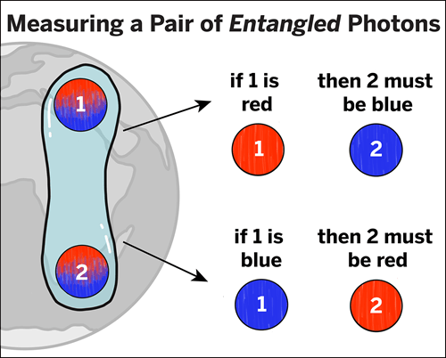 Another example is entanglement, in which a measurement of any two-valued state of a particle (such as light polarized up or down) made on either of two “entangled” particles that are very far apart causes a subsequent measurement on the other particle to always be the other of the two values (such as polarized in the opposite direction).