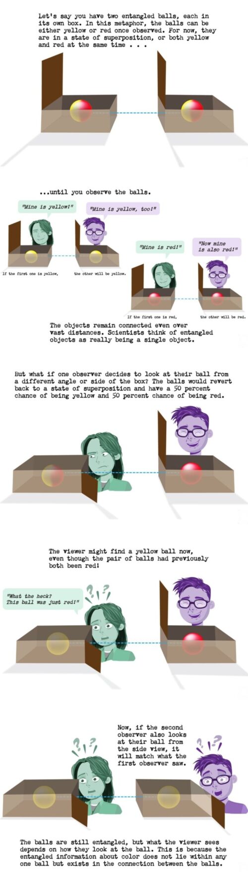 It gets stranger: putting two particles into a state of joint superposition can lead to entanglement, which means that their quantum states remain intertwined even when the particles are far apart.