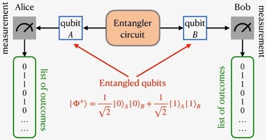 Local hidden variables mean properties contained within the individual particles themselves giving rise to entanglement. For example, if you take two gloves and send one to New York and one to Tokyo, discovering that the glove in New York is right-handed immediately tells you the glove in Tokyo must be left-handed. That’s a classical correlation—the outcome is predetermined, and the information simply reveals an already fixed fact. The hidden variable handedness is predetermined. Hidden variable theory in quantum mechanics posits underlying variables that determine quantum event outcomes, providing a deterministic description. John Bell, a brilliant Irish physicist devised a scheme to test whether the notion of hidden variables made sense. Bell produced an equation now known as Bell’s inequality that is always correct – and only correct – for hidden variable theories, and not always for quantum mechanics. Thus, if Bell’s equation was found not to be satisfied in a real-world experiment, local hidden variable theories can be ruled out as an explanation for quantum entanglement. It has been proved experimentally that there is no hidden variable, no predetermined outcome, only randomness but randomness is correlated to certainty in entanglement.