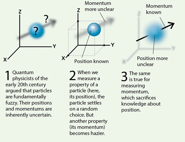 In 1927, Werner Heisenberg argued that it’s impossible to know both a particle’s position and momentum exactly. Measuring one simply makes the other fuzzier (see figure below). Particles are fundamentally indecisive — neither precisely here nor there, and both at once. Making measurements effectively forces particles to choose how to behave.