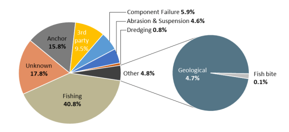 In water depths greater than 1,000 metres, faults are almost always caused by natural events such as underwater seismic activity, underwater landslides, current abrasion etc.