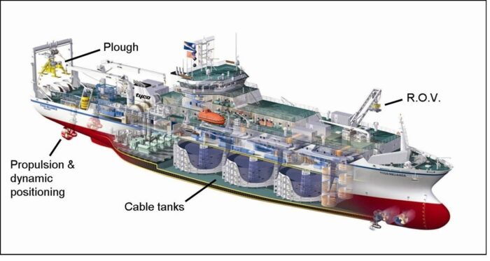 Cable vessel (also cable ship) – a vessel purpose-built or modified to lay and repair submarine cables. When engaged in such operations, the cable vessel displays special insignia or ‘shapes’ and navigation lights to alert other vessels to its restricted manoeuvrability as required by international law.