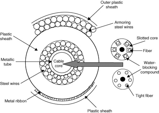-23. Submarine cables are engineered to survive extreme deep-sea pressure and protect against damage, comprising several layers of material. Undersea cables withstand immense hydrostatic pressure, increasing by 1 atmosphere (14.7 psi) every 10 meters depth, reaching up roughly 500 atmospheres of pressure at ocean depths of 5,000 meters. At their core, they use glass optical fibers surrounded by copper or aluminum for electrical power, covered in polyethylene insulation, and armored with steel wires for protection. Modern, deep-sea communication cables often use lightweight armored (LWA) or lightweight (LW) designs for flexibility, while shallow, high-risk areas use heavily armored (single/double) cables. These are classified by the level of protection needed against fishing, anchors, and ocean currents: The double armored submarine cable is used at the shore-end, terminated at the beach manhole at the cable landing site, and is interconnected with much lighter land cable going onward to the cable landing station.