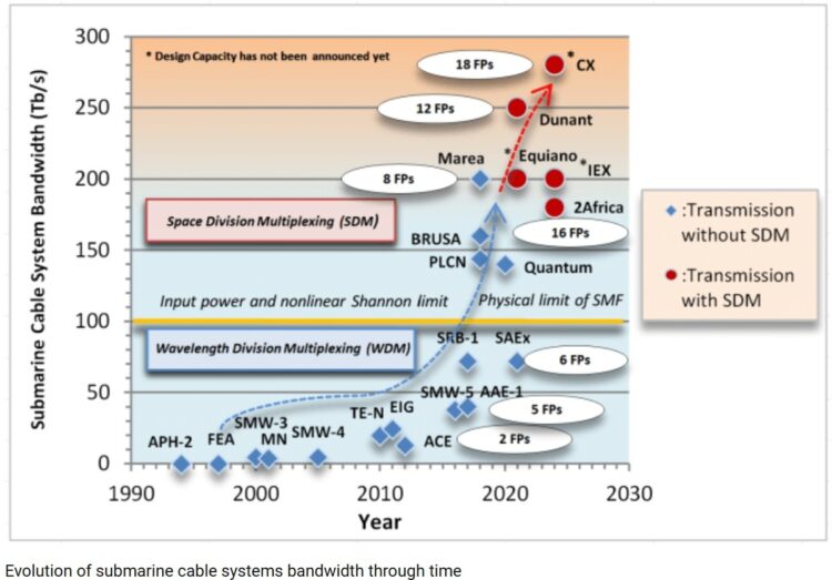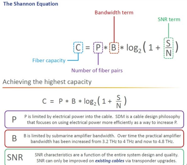 To achieve more capacity, we need more submarine cables, more number of channels (C+L band system), more number of fiber pairs, increasing per fiber capacity, and increasing channel bandwidth i.e. transponder/modem capacity. By leveraging the latest SLTE modems alongside SDM, MCF, and C+L Band wet plants, we should be able to achieve submarine cables with total capacities in the multiple petabits per second (Pbit/s), where 1Pbit/s is 1,000,000,000,000,000 bits per second.