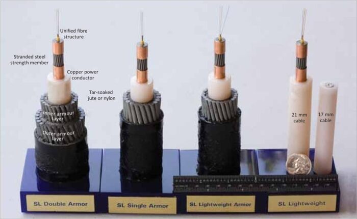 -24. The basic deep-water cable (water depths greater than 2,000 metres) is usually 17 – 21mm diameter and they weigh 1.4 tons per kilometre. The combined length of the cables is estimated to be more than 1.5 million of kilometres. If all cables were put in sequence one after another, they would go around the globe 35 times. The core fibers themselves are extremely thin, measuring only about 9 µ for single-mode. In water less than 2,000 meters deep, additional protection is added against environmental, fishing and anchor damage in the form of external steel wire armour clad within a polypropylene serving. There may be one or more layers of armour applied to the cable. The heaviest form of armoured cable may have in excess of 70 tonnes breaking strength. While the cable may only break or part at high tensions, damage to the optical path or to the electrical insulation (the polyethylene) can occur at much lower tensions such as when fishing gear may become engaged with the cable. This is because the cable becomes bent to a radius less than its minimum safe limits (usually 1.5 metres radius). Armoured cables vary in size depending on whether one or more armour layers are used but may be up to 50 mm diameter. Breaking strains vary from 20 – 70 or more tonnes.