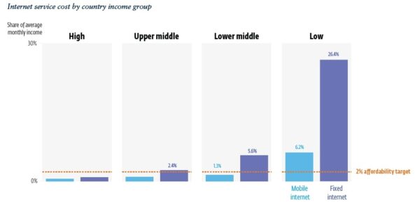 Internet subscriptions in wealthier countries typically cost less than 1 percent of an average monthly income for both mobile internet services and fixed-line service. In low-income countries, those figures jump to 6 percent and nearly 26 percent respectively, levels that only a small share of users can afford. Sub-Saharan Africa has some of the highest internet prices of any region in the world. A fixed internet subscription there costs nearly a fifth of an average monthly income.