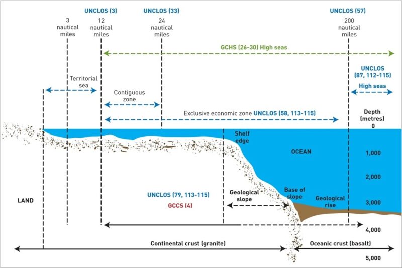 Continental shelf – a zone, adjacent to a continent or island, which extends from the coast as a gently sloping plain (0.1º) to the shelf edge, where the seabed steepens to form the continental slope. The average depth of the shelf edge is 135 m. The precise limits of a nation’s legal continental shelf boundary claim beyond the EEZ are determined in accordance with criteria set forth in UNCLOS, but in no case shall extend beyond 350 nautical miles from the coastal state’s coastal baseline.