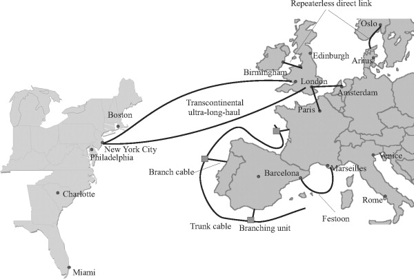 Cable network – a regional to global grouping of interconnected submarine cables, including repeaters and landing stations. A network provides redundancy in the event of a cable failure, in which instance voice and data traffic can be re-routed via intact parts of the network.