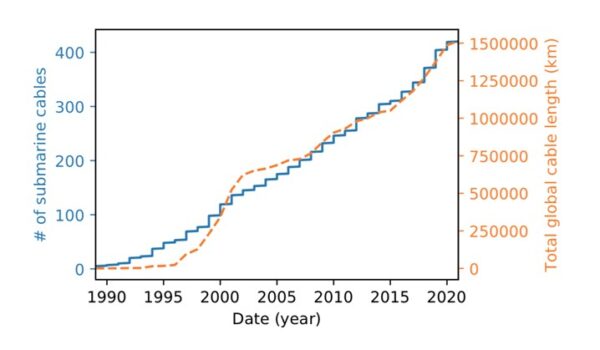 Telecommunications providers have used undersea cables (also known as submarine or subsea cables) for long-distance communications for more than 170 years. The English Channel Submarine Telegraph Company laid the first undersea cable in 1850 between England and France, to enable international communications over telegraph. The first successful transatlantic telegraph message carried by undersea cable was transmitted in 1858, the first transatlantic telephone cable entered operation in 1956, and the first transatlantic fiber-optic cable was laid in 1988 and called the TAT-8, that had the capacity to carry 40,000 telephone connections simultaneously, four times the capacity of previous cables. Today, more than 600 cables span 1.5 million kilometers globally enough to circle the Earth more than 35 times and connect to more than 1,700 landing stations (i.e., the point where the undersea cable makes landfall). The ocean’s fibre optic network links major data hubs like New York, London, Tokyo, and Sydney, while also increasingly reaching into developing regions to help bridge the global digital divide. The cables connect every continent except Antarctica, and serve as the backbone for the global internet. Industry experts estimate that the undersea telecommunication cable network carries about 95% of intercontinental global internet traffic, and 99% of transoceanic digital communications (e.g., voice, video and data) including trillions in international financial transactions daily.