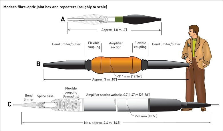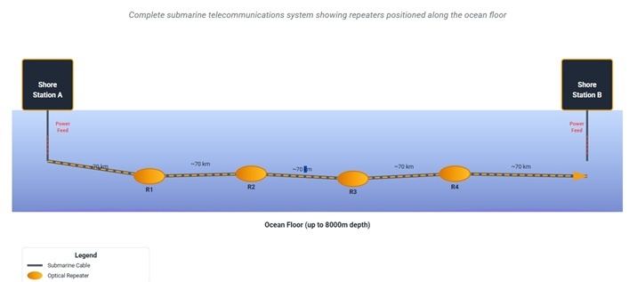All telecommunications signals lose strength in proportion to the distance travelled, which explains why repeaters are required on the longer submarine cable routes. Repeater is a submerged housing containing equipment that boosts the telecommunications signal at regular intervals along the cable. Each repeater is powered via an electrical current that is fed into the submarine cable system from the shore-based terminal stations. In a modern fibre-optic submarine cable system, the repeater spacing is typically 70 km.