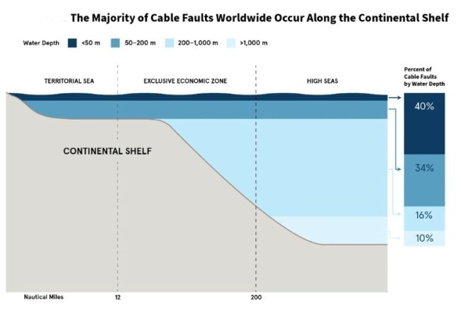 -33. It is estimated that 150– 200 cable faults occur annually world-wide. It is clear that most faults occur on the continental shelf, near land in water depths of less than 100 m. This is to be expected, since the vast majority of human activities that involve seabed contact take place in relatively shallow waters. The remaining faults occur across a wide range of depths, including oceanic areas more than 4,000 m deep. In fact, the deeper the ocean, the smaller the likelihood of cable faults.