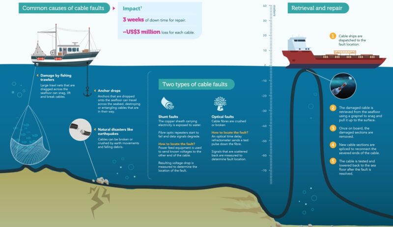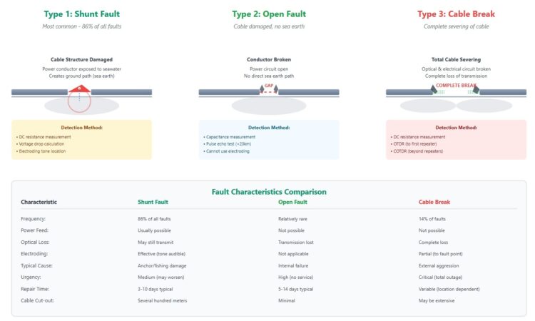 Cable damage comes in many forms. When damage is severe enough to affect transmission, it is considered a fault. An undersea internet cable fault is a physical breach, break, or malfunction in a subsea communication cable. Three main fault types (shunt, open, break) require different localization and repair approaches.