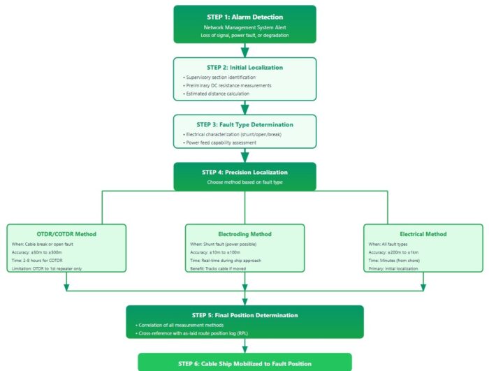-34. Undersea cable breaks are identified by immediate, large-scale internet service disruptions or slow speeds in affected regions. Operators detect the exact location using monitoring software that measures voltage drops, or by sending light pulses (Optical Time-domain Reflectometer) through the cable to measure reflection timing. Accurate fault localization is critical for efficient repair operations. Multiple complementary techniques are employed to identifying and locating breaks. Spread-spectrum time-domain reflectometry (SS-TDR) is often used to locate and characterize a fault on active cables.