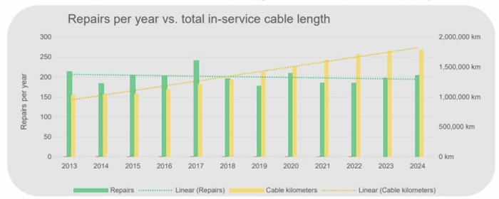 -52. The numbers of faults remain steady from 2013-2024, around 200 faults per year in the world, despite a 50% increase in total in-service cable length from 1.5 million to 2.7 million kilometers in 2025. There is remarkable decrease on the fault per year per distance. This achievement is a combination of better geophysical surveys, better armored cables, ability to do deeper burials, better public awareness of where the cables are located, and a higher premium placed in design on reliability.