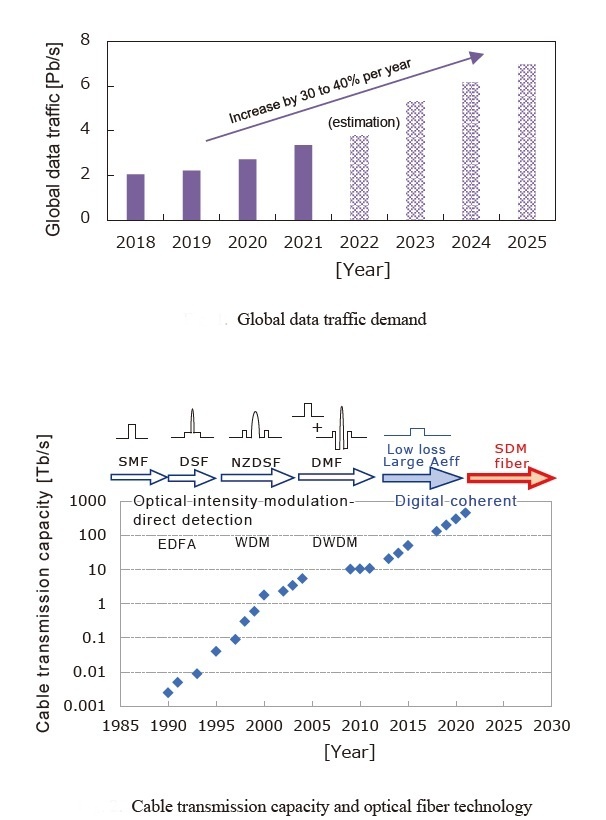 In the 2010s, the optical signal to-noise ratio (OSNR) emerged as the main constraint factor by the introduction of digital coherent technology. Higher OSNR enables higher spectral efficiency by allowing more complex, dense modulation schemes (like QAM), enabling faster, more reliable data rates within the same channel bandwidth. A higher OSNR indicates better signal quality, lower Bit Error Rate (BER), and longer signal reach. To improve OSNR, it is important to reduce fiber nonlinearity and transmission loss. Therefore, an optical fiber having low nonlinearity by enlarging effective area (Aeff) to 130 to 150 μm2, and ultra-low loss (0.15 dB/km) by applying pure silica core technology was optimal. This fiber represents very high performance compared with standard SMF (Aeff: 80 μm2, transmission loss: 0.18 to 0.20 dB/km).