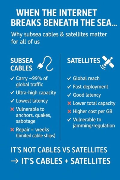 Undersea systems have fundamental advantage: massive capacity. A single fiber optic cable is able to transmit 250 terabits of data per second. When communications companies lay fiber optic cables, each cable contains dozens of individual fibers. A single satellite can transmit 260 gigabits of data per second and that bandwidth must be divided up among the thousands of customers using the internet simultaneously. One fiber pair can handle the entire daily traffic of countries like India or Japan. Cables can carry far more data at a fraction of the cost of satellites. LEO satellites, the preferred medium of satellite internet are costlier than undersea cables (USD 100-500 million).  Satellite networks cost approximately USD 5-10 billion and have a shorter lifespan (5-10 years) than undersea cables (25 years).
