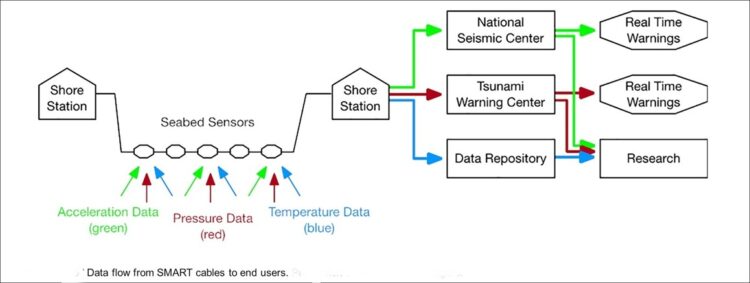-59. SMART – short for Scientific Monitoring and Reliable Telecommunications – cables are equipped with sensors on their repeaters that measure seismic activity (accelerometers), temperature fluctuations and pressure changes. It can be used to improve early-warning systems for tsunamis and earthquakes as well as tracking changes in the climate. Data generated by SMART cable sensors will be transmitted along the underlying cable to a shore station where it may be stored in raw form, processed, and transmitted onward to data repositories, national agencies, and academic institutions. More accurate data regarding tsunami activity can save lives as well as minimize the likelihood of unnecessary warnings and evacuations.