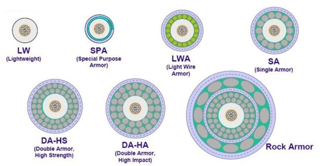 Armour – normally galvanized steel wires (of circular cross-section) laid around the core of the cable to provide both tensile strength and protection from external damage.