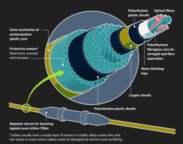 -22. Undersea internet (telecommunications) cables and power cables both lie on the seabed but differ significantly in purpose, construction, and operation. Internet cables use fiber optics to transmit data via light, are thinner, and require repeaters to boost signals. Power cables are much larger, heavily armored to transmit high-voltage electricity, and use converter stations rather than repeaters.