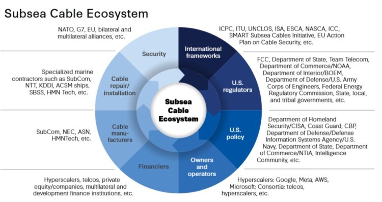 -56. Undersea cables are critical to global communications infrastructure, supporting everything from financial transactions to national security communications, making them a prime target in the escalating great power competition between the U.S., China, and Russia, as well as for other state and non-state actors. The control and ownership of these cables can influence international relations and geopolitical dynamics.